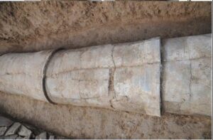 Measuring 30-40 centimeters in length and 20-30 in diameter (12×15 and 8×12 inches respectively) the segments of pipe fit one over the other wide-end to thin-end like cups. Most of the pipes followed the road down to the southern gate of the settlement, where the largest and most active ditches were discovered by the archaeologists.