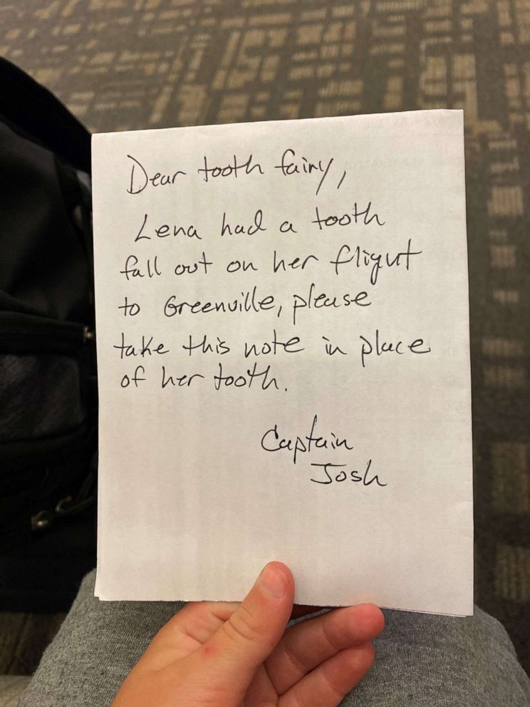 “Dear Tooth Fairy, Lena had a tooth fall out on her flight to Greenville,” wrote Duchow, who piloted the flight. “Please take this note in place of her tooth.”