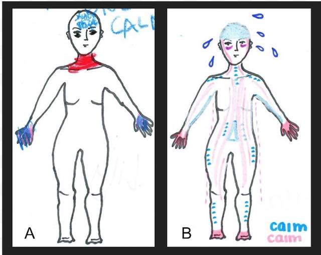 During the program, the students met twice a week for a 50-minute session with the research team. Each session began with an activity in which students would map where they were feeling stressed on a drawing of a body. Then the teens would participate in mindfulness and art activities before closing the session with another body map.