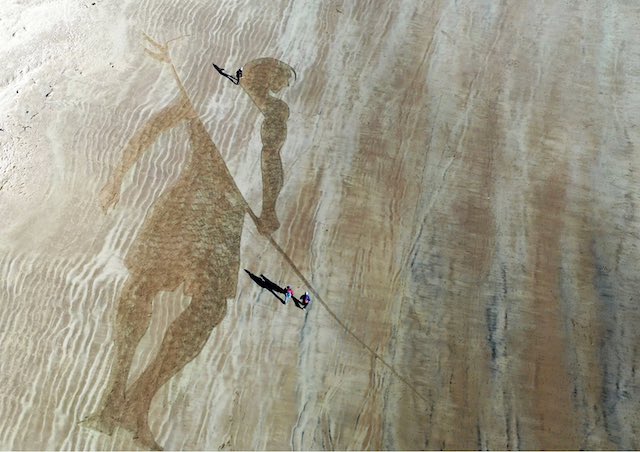 Claire Eason’s huge sand sketch of a sea-lover was only visible for a few hours before being washed away on the tide.