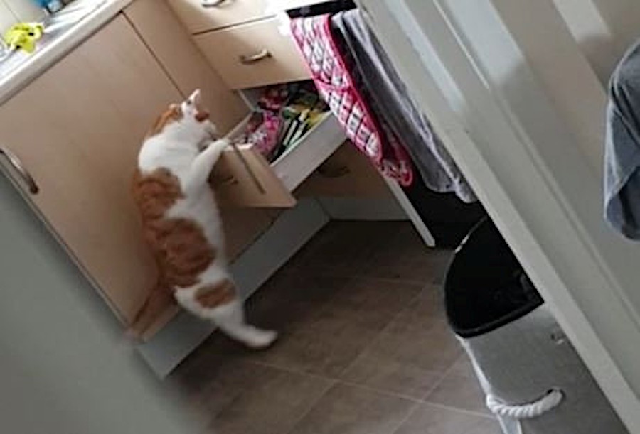 A sneaky feline has learned how to open kitchen drawers and raid its owner’s stash of sweets.