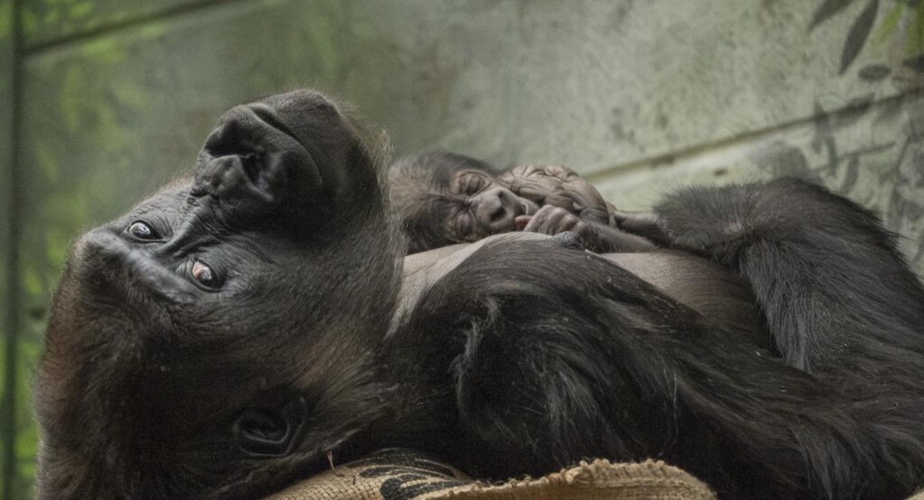 “After a very quick labour, Mjukuu was spotted on camera tenderly holding her newborn and demonstrating her wonderful mothering instincts – cleaning her infant and checking it over,” reported London Zoo’s Primates Section Manager Kathryn Sanders.