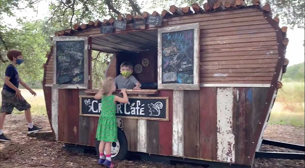 Designer Jodi Bade made ‘The Critter Cafe’, which is pulled by a vintage garden tractor and filled with child-safe kitchen equipment for that most persistent of childhood fancies, tea time. Watch her video showing the remarkable detail on the inside.