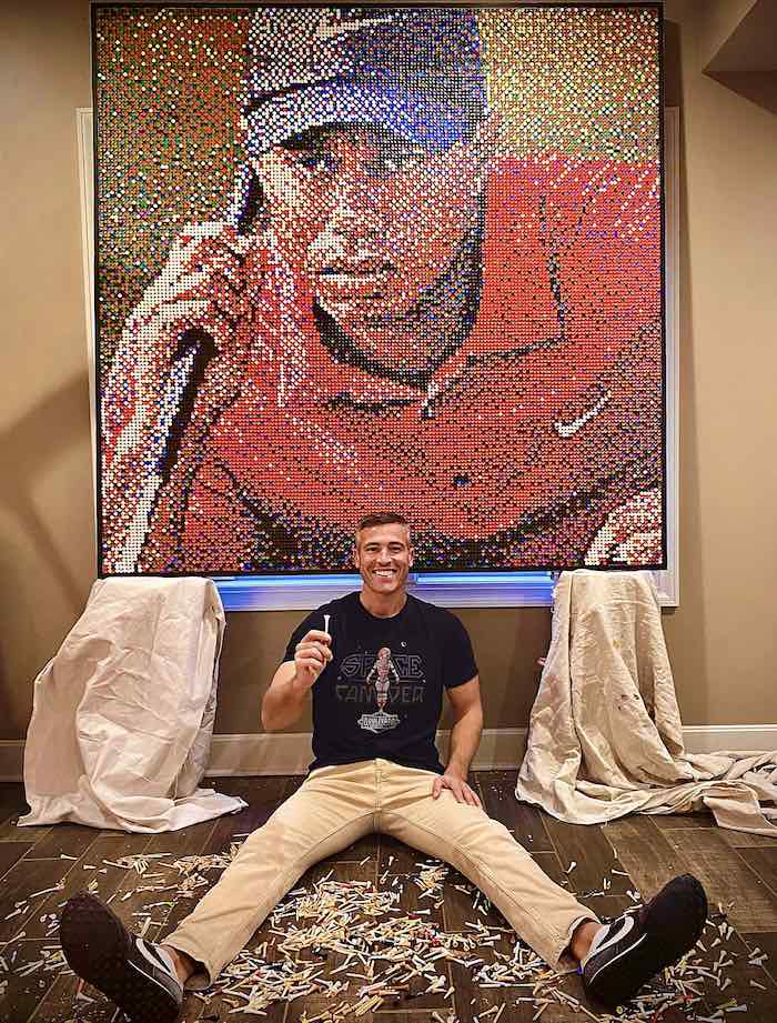 Previous works by the artist includes a Muhammad Ali oil canvas, an Elon Musk mosaic bead portrait, and a painting of the Kelce brothers, two NFL football stars.