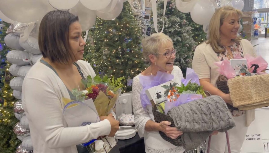 Deborah’s mother, who had fully recovered after getting stitches, was also on hand and given a gift basket. She voiced her gratitude to the two women who came to her aid—especially Belia—while store workers applauded.