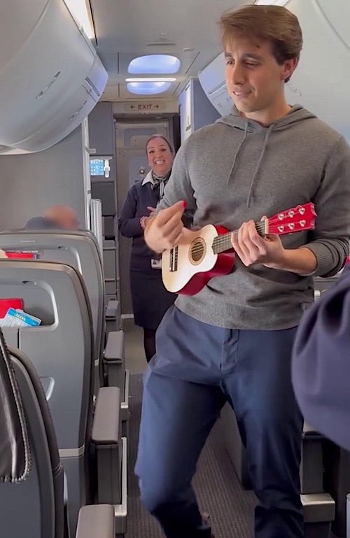 Sam managed to smuggle a ukulele onto the plane without his girlfriend knowing and worked with flight attendants to create codewords to pull off the surprise.
