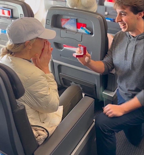 A man recreated a scene from the The Wedding Singer and proposed to his girlfriend mid-flight—with the help of giddy flight attendants.