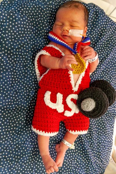 A hospital presented its new born babies with tiny hand-crocheted Olympian outfits and gold medals.