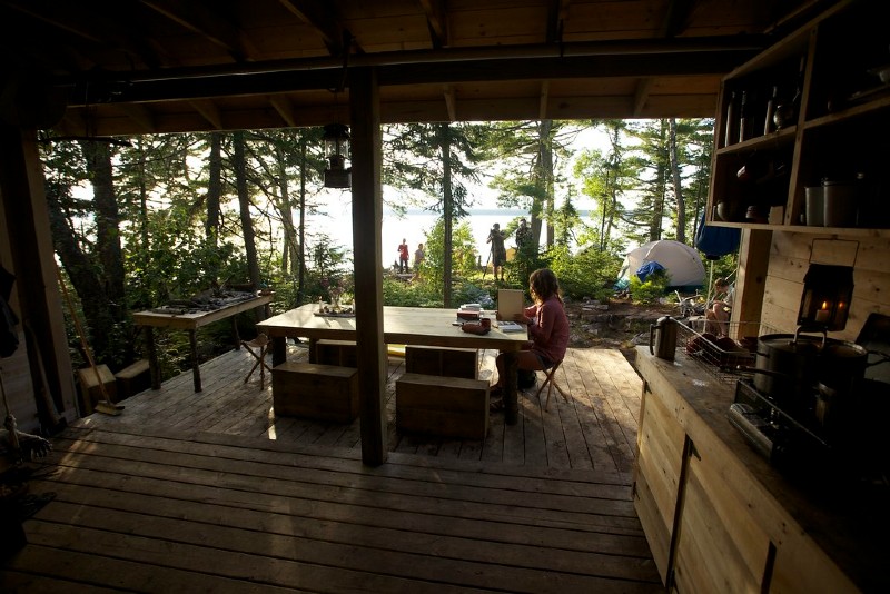 Resident accommodations come in the form of two multi-purpose three-sided shelters as well as tents and camping gear. The only fully enclosed space is a wood-fired sauna.