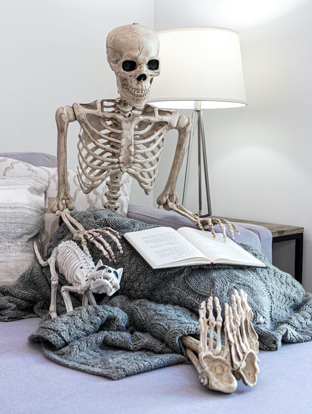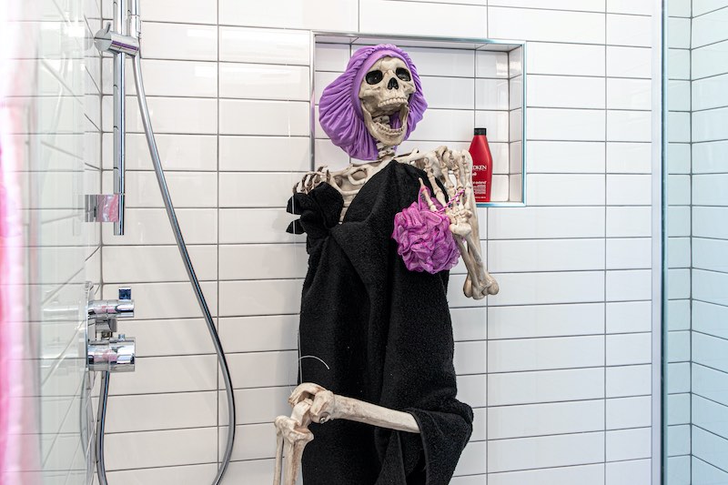 This hilarious photo series captures some of Kerr’s decorations in action as the skeletal partygoers are depicted posing by the stove, lounging on the couches, and even washing in the shower.