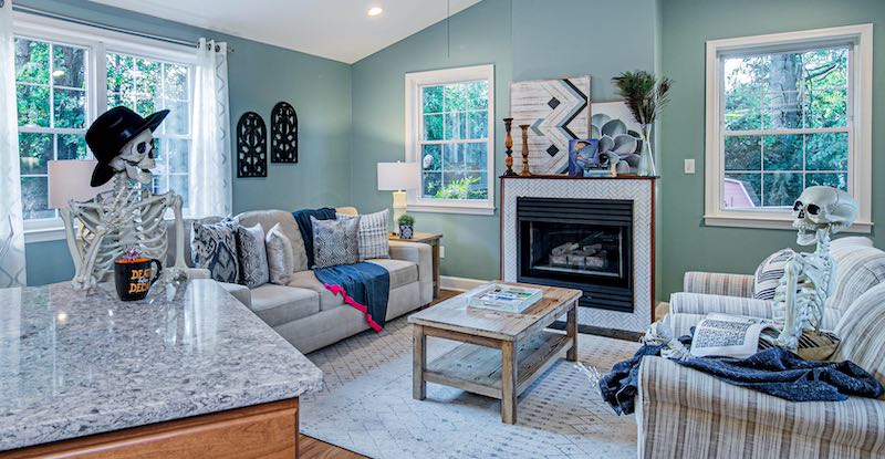 A real estate agent in Washington D.C. has gone turbo this Halloween by decorating the homes she has been showing with 12-foot skeletons.