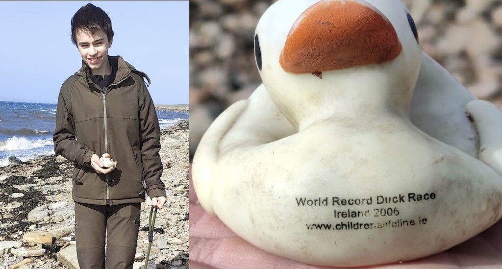 A rubber duck that escaped a failed world record race 18 years ago has been found by a teen washed up on a beach 423 miles away.