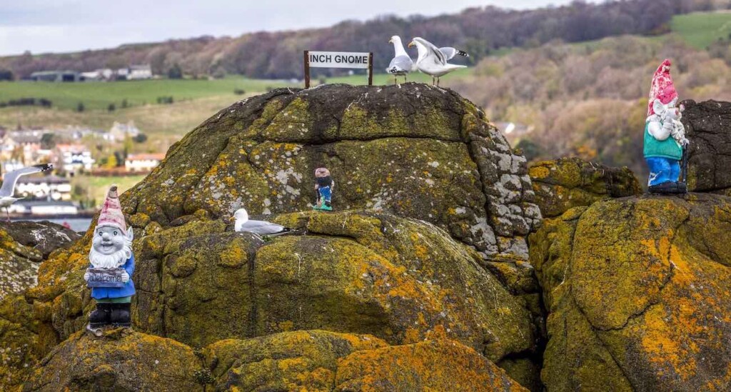 The gnomes beam their mischief from the rock of Swallow Craig which sits just off Inchcolm Island in the Firth of Forth.