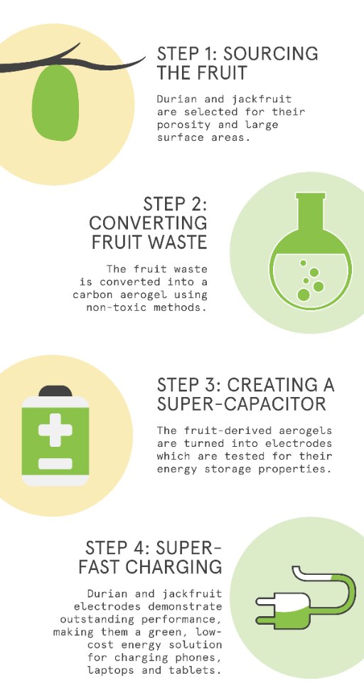 Researchers from the University of Sydney have done just that by developing a method that uses durian and jackfruit waste to create energy stores for rapid electricity charging.