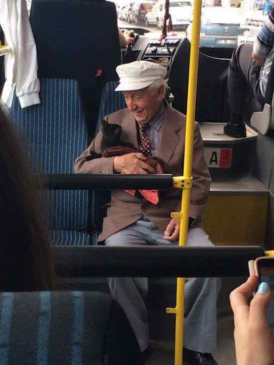 We have no idea who this man was, where he was going, or why he was carrying a kitten in his arms—all we know from this image is that he may be the happiest man ever to ride a bus.