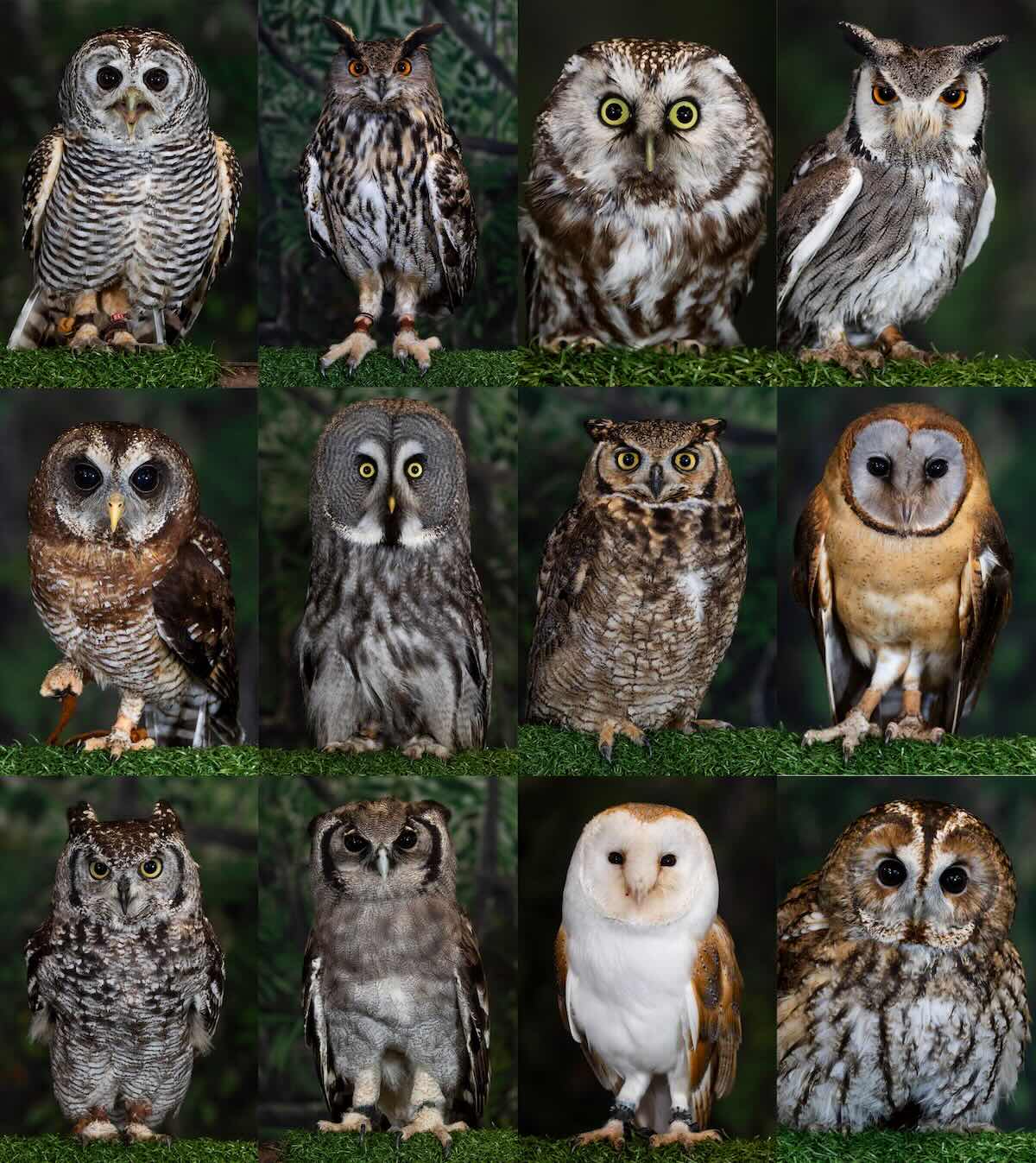 Middle row: ashy faced owl, lesser horned owl, great grey owl, African spotted eagle owl