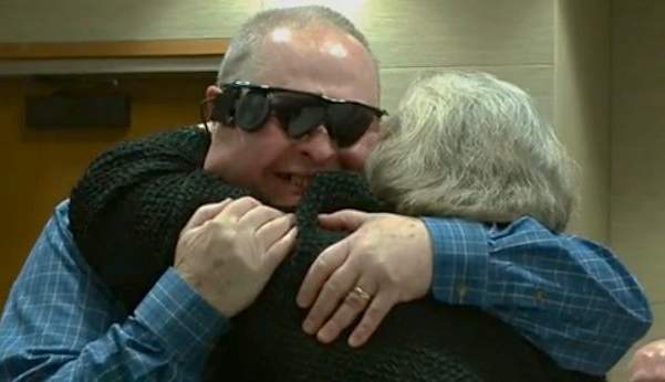 For the first time in ten years, Zderad was able to make out human forms and outlines of objects, chairs and tables. He even saw his reflection as a silhouette in a window. But the first indication that the device worked came when he lunged out to grab his wife’s hands as she sat before him. They both broke into tears. (Watch the video below)