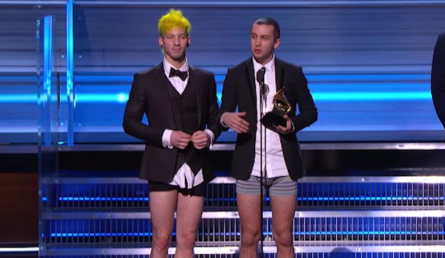 21 Pilots, the contemporary pop band responsible for winning the Grammy for Best Pop Duo at last night’s award ceremony, got prepared for their acceptance speech by pulling off their trousers and casting them aside.