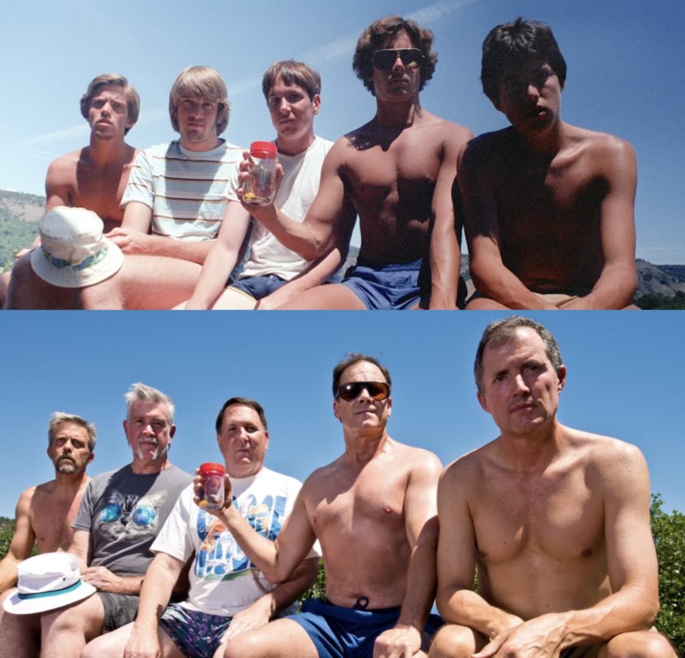 After graduation, they vacationed together at Wardlaw’s grandfather’s cabin on Copco Lake near the Oregon border. There, JD took the first photo of the five of them sitting next to each other.