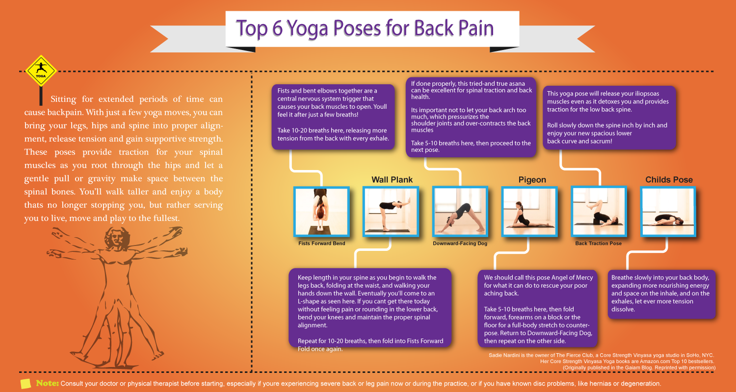 With just a few moves, you can bring your legs, hips and spine into proper alignment, release tension and gain supportive strength. These poses provide traction for your spinal muscles as you root through the hips and let a gentle pull or gravity make space between the spinal bones. You’ll walk taller and enjoy a body that’s no longer stopping you, but rather serving you to live, move and play to the fullest. (Download the info-graphic to keep the 6 poses as a ready reference – Thanks to Mehndi Rao for creating the neat graphic!)