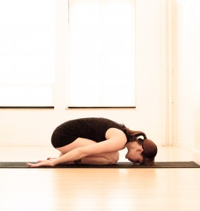 Roll over and take Child’s Pose for one minute or more. Try knees wide, big toes closer, but end with knees together for a neutral spinal stretch. If your head doesn’t touch the floor, place a yoga block or fists under your forehead so you can relax completely.