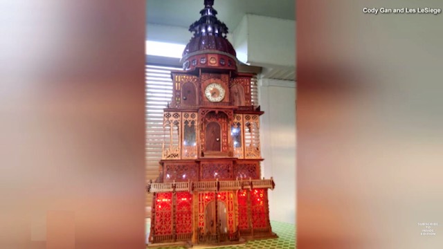 Gerald LeSiege took up woodworking to help cope with his wife’s illness, and the pressure of being a caretaker. What resulted was a five-foot cathedral clock made with ten different types of wood intricately carved and illuminated with lights and glass windows.