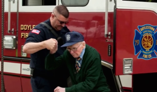 Bill Grun of Doylestown, Pennsylvania was given the birthday wish of a lifetime when firefighters from the Doylestown Fire Company No. 1 showed up at his retirement home.