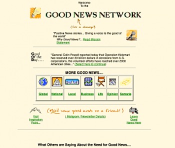 Working in TV news in Washington, D.C., freelancing for companies like CNN (the ‘Constantly Negative News’), Geri first conceived of the Good News Network in 1982. Later, after leaving her video career, and raising three children in 1997, she taught herself to code in html, and the Good News Network website, on a simple yellow background, was born.