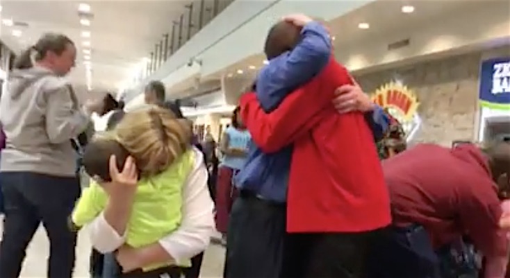 Seven-year-old Bronson is a blur as he runs from the airport gate into his mother’s arms and 14-year-old Joseph isn’t far behind giving his new dad a big hug.