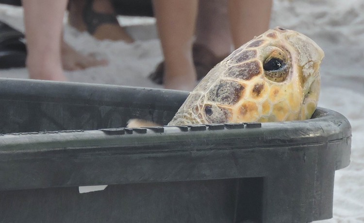 Even the sky seemed to be smiling as a loggerhead sea turtle returned to the ocean after 14 months of rehabilitation.