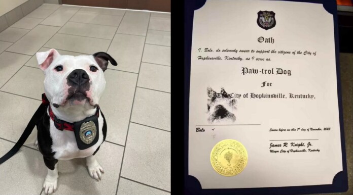 “[O]n Tuesday, during the Hopkinsville City Council meeting, Bolo was officially made a part of the team and sworn in by Mayor J.R. Knight as HPD’s very first Paw-trol Officer! We can’t wait to follow this sweet pup’s career on the force,” the Department wrote on Facebook.