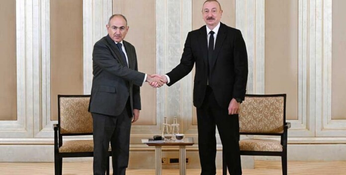 Prime Minister Nikol Pashinyan (left) shakes hands with Azerbaijani President Ilham Aliyev – Credit: Azerbaijani Presidential Press Office