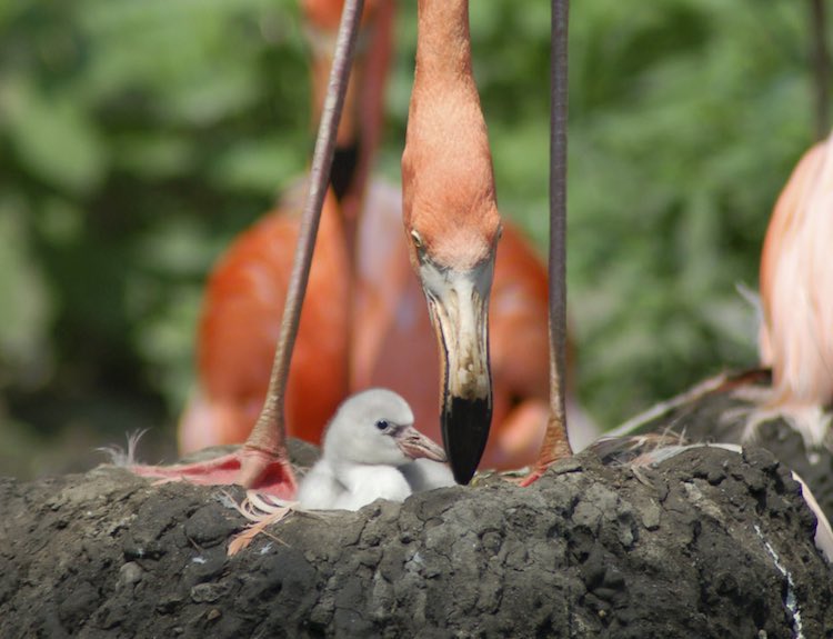 It’s common among full-time dads in the animal kingdom to take turns with the females incubating their eggs. The male flamingo sits on top of the nest mound and carefully lifts and turns the egg over and over. Once the chick hatches, the male flamingo produces “crop milk,” which is the sole source of nourishment for young flamingo chicks, and made of a secretion of the upper digestive tract.