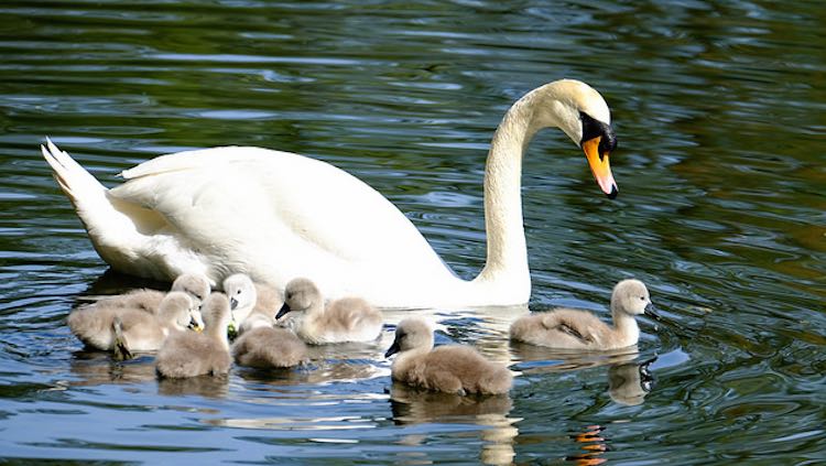 Swans are famously monogamous with lifelong partners. From the minute the female swan lays her eggs, the male and female take turns incubating them until they hatch. Once the baby swans hatch, they sit on their dad’s back and keep warm while he looks for food.