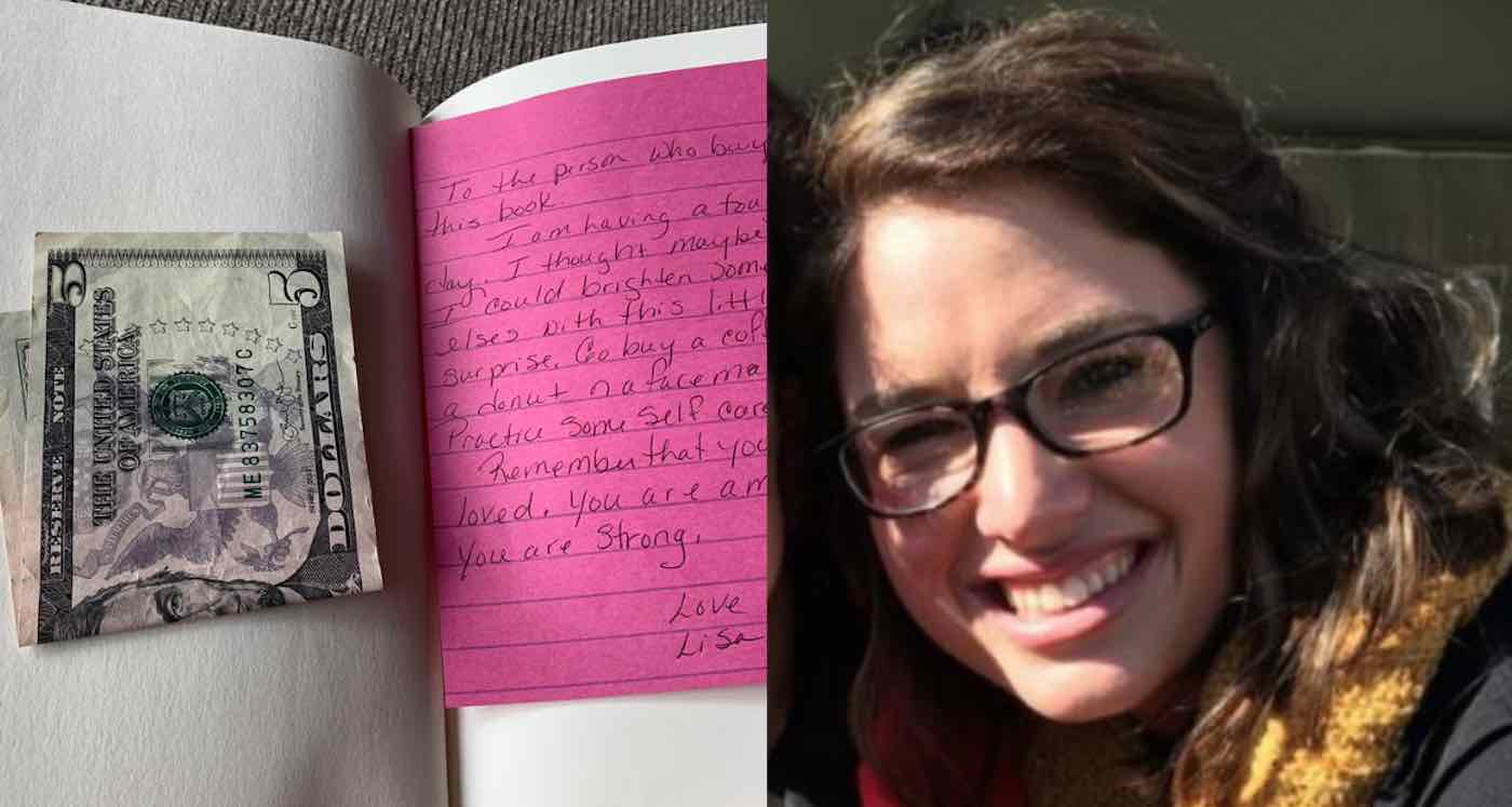 She then found a pink sticky note tucked between the chapters. The note read: “To the person who buys this book: I am having a tough day. I thought maybe I could brighten someone else’s with this little surprise. Go buy a coffee, donut, or a face mask. Practice some self-care today.