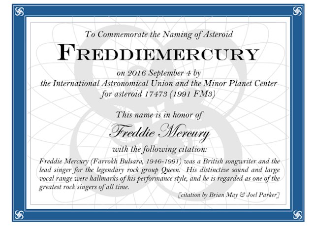 “We have a nice certificate of ‘adoption’ issued by the International Astronomical Union and the Minor Planet Center, which says ‘This name is in honor of Freddie Mercury, with the following citation: