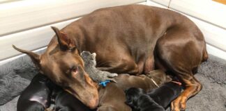 Doberman Dog Nurses Tiny Abandoned Kitten Alongside Her Pups – the Adorable Photos Will Melt Your Heart