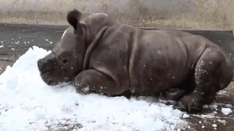 Most human children are delighted by the sight of snow – and this 2-month-old white rhino is no different.