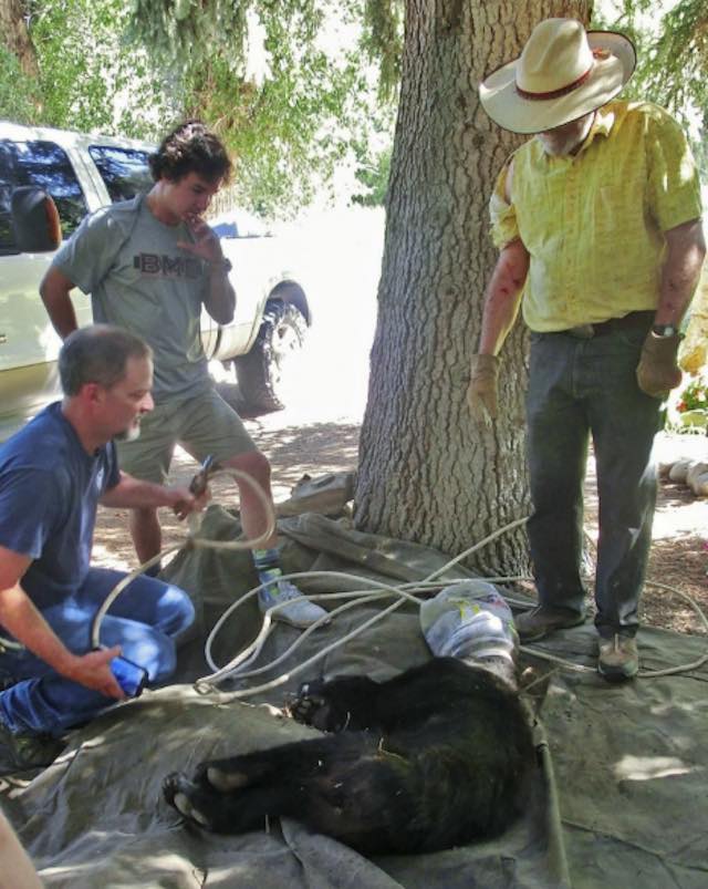After a bit of a tussle, the bear scurried up a nearby tree. Jim tied the rope to the trunk so it wouldn’t run off until authorities arrived.