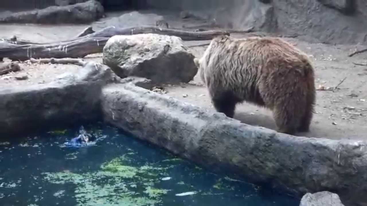 A brown bear at the Budapest Zoo pulled a drowning crow from the water.