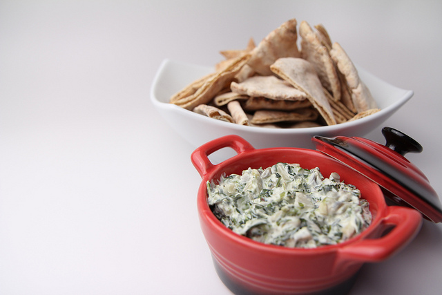 Additionally, spinach and artichoke is commonly served with bread or tortilla and pita chips. If the option is available, cut calories by skinny-dipping. Skip the chips and instead dip with veggies like carrots, celery, or red pepper strips. Because these vegetables have a high water content, they fill you up on minimal calories.