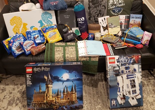 The carton was emblazoned with a big red #95 on the sides—a tribute to Shelby’s 95th RedditGifts exchange, a fact that was mentioned on her gift profile page. That page is where Gates and his team got most of the information to personalize each gift item. And there were tons of presents geared toward her interest in books, Star Wars, Harry Potter, the Zelda game, Twin Peaks, cats, and outdoor leisure.