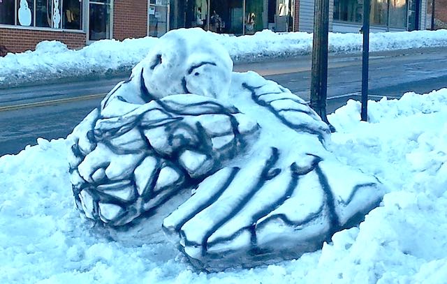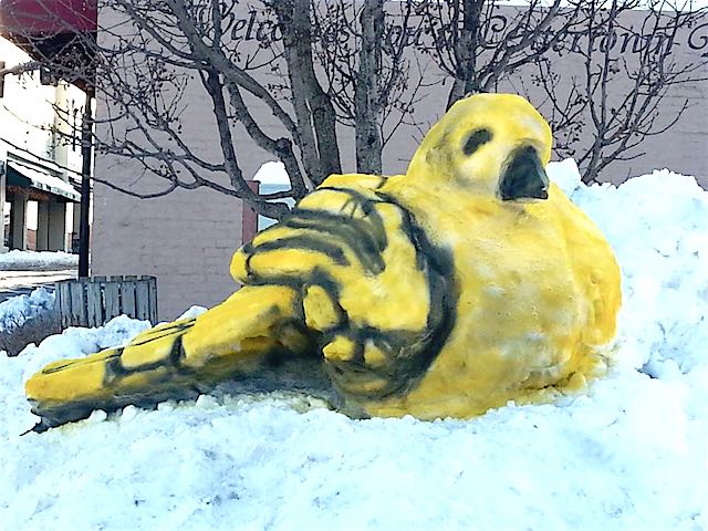 It didn’t take long for other people in town to figure out the sculptor is “Bartertown” Bobby Fuller, a local artist who usually works in other media, but took advantage of the snow to create some fleeting, feathered public art for his neighbors.
