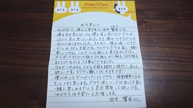 “My son Hibiki is blind and has perfectly cleared every game in the Rhythm Tengoku series, the only games he can play. He sent Nintendo a letter and they actually responded! Them sending such a sincere correspondence to just one person is truly divine customer service. Nintendo, we’re anxiously awaiting the next installment in the series!”