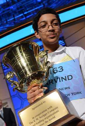 After Pranav Sivakumar misspelled “cyanophycean” in Round 15, Arvind correctly spelled “tokonoma” and “knaidel”, smiling and nodding as he did. His parents and brother joined him on stage as Arvind hoisted the trophy over his head.