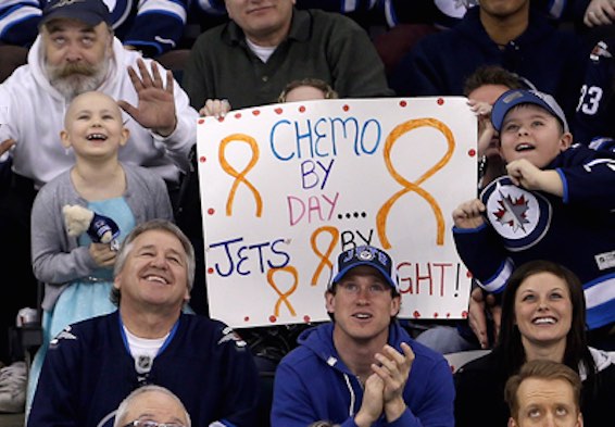Earlier this year, Alyx was given a standing ovation when her family was shown on the Jumbotron screen during a game. She and her mother had been holding up a sign that read, “Chemo by day, Jets by night,” and once players on both the Jets and Dallas Stars saw them up on screen, they began banging their sticks on the ice. The crowd, too, gave a standing ovation.