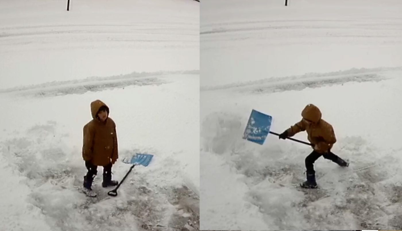 “My son Peyton offered to go shovel the 8 inches of snow we got earlier today but quickly realized he was in over his head,” she told Licensor. “My security cameras caught his mini-tantrum.”