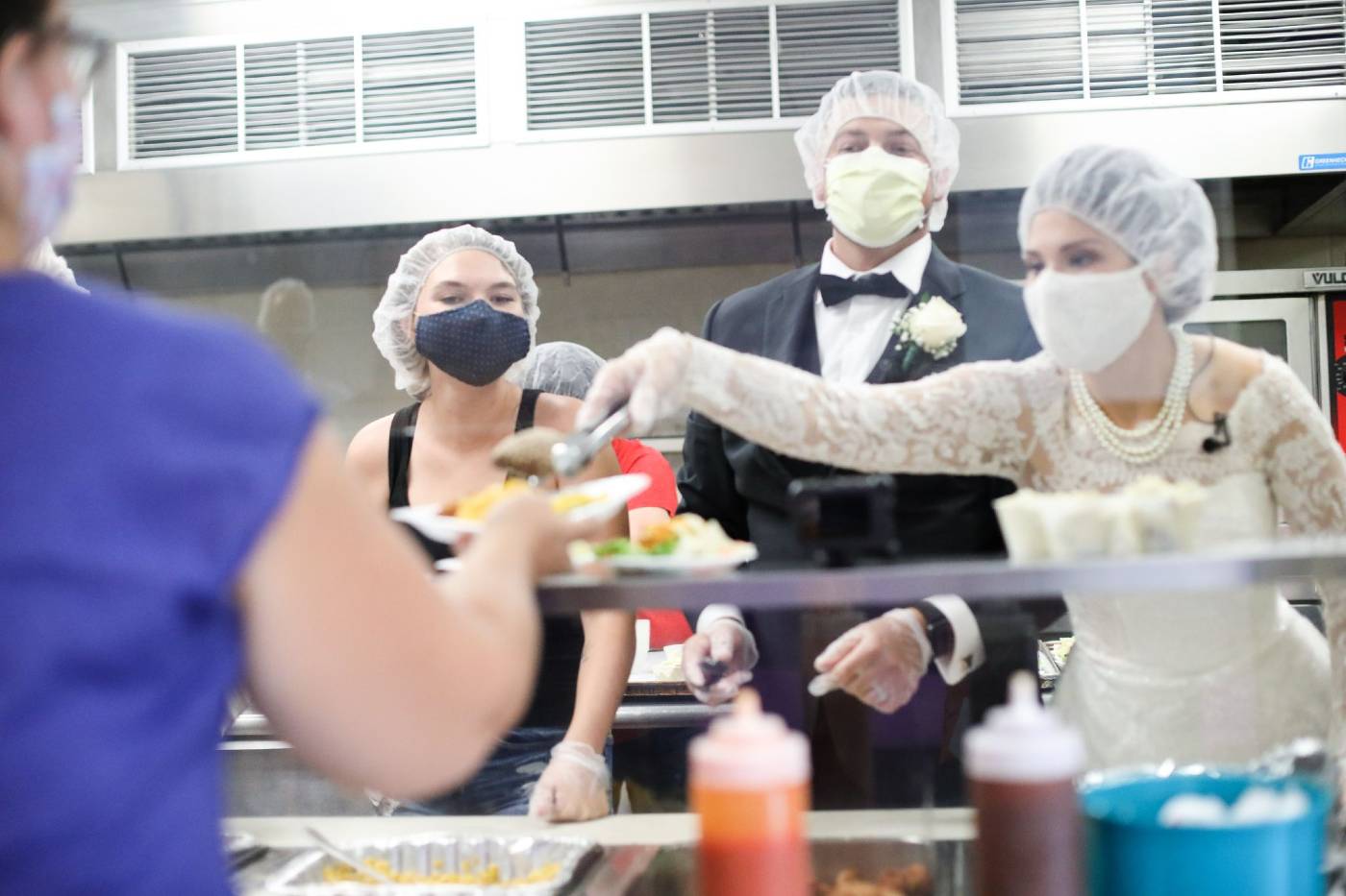 After exchanging vows in an intimate August 15 ceremony attended by family and close friends, the couple—still in their wedding gear—headed to Laura’s Home. The bride swapped her veil for a hairnet (the groom wore one as well). Both suited up in face masks and food-service gloves, then stepped behind the cafeteria counter to help dish up the kind of heartwarming meals that gave a whole new meaning to “service with a smile.”