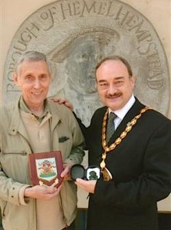 Photo: Tony Chambers, left, presented with the coat of arms of Hemel Hempstead, and giving the mayor of his birth town a New Zealand “Maori Tiki” good luck charm in return — supplied by Hemel Hempstead Gazette/Victoria West.