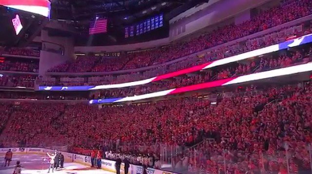 Eric Bosman happened to be filming the anthem because he has 2 small daughters who always stand up with him at home to sing both countries’ anthems while watching hockey games on TV.